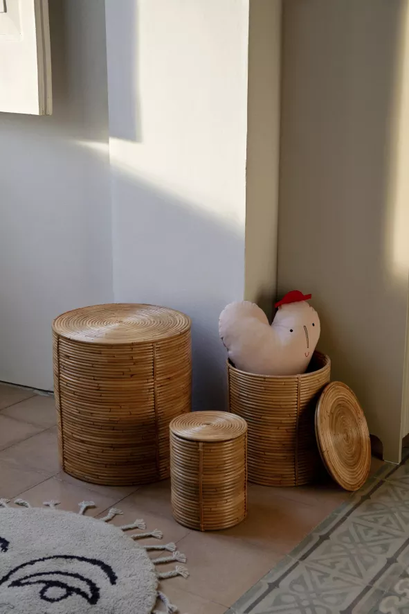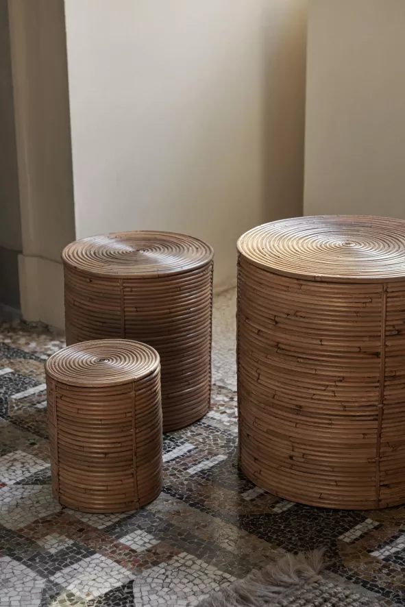 De Column opberger set van 3 van Ferm Living bestaat uit manden in verschillende formaten. De grootste opberger heeft een diameter van 40 centimeter en een hoogte van 43 centimeter. De middelste opberger heeft een diameter van 30 centimeter en een hoogte van 34 centimeter. De kleinste opberger heeft een diameter van 20 centimeter en een hoogte van 25 centimeter. De manden zijn hand gemaakt van donker gekleurd rattan en wegen bij elkaar 5,4 kilogram. Maak de Column manden schoon met een vochtige doek.