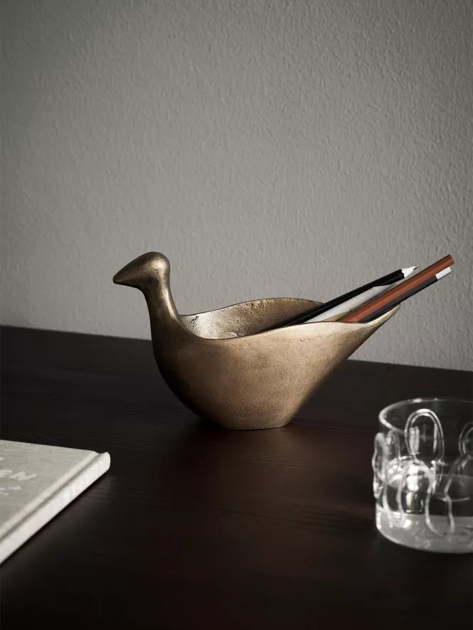 Het Coot pennenbakje antique van Ferm Living is een vogelvormige pennenhouder. Het bakje heeft een lengte van 19,2 centimeter, een breedte van 7,4 centimeter en een hoogte van 11,8 centimeter. De houder is gemaakt van 100% gerecycled gegoten aluminium en heeft een messingkleurige afwerking. Het pennenbakje is schoon te maken met een vochtige doek. Het Coot pennenbakje wordt geleverd in een cadeauverpakking.
