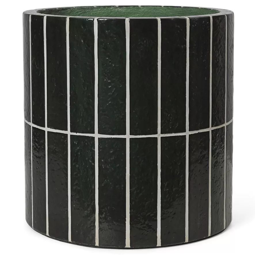 De Pillar bloempot van Ferm Living is donkergroen en heeft een diameter van 40 centimeter en een hoogte van 40 centimeter. De pot is gemaakt van glasvezelversterkt beton met een glazuurlaag. Deze glazuurlaag is met de hand aangebracht en maakt elke bloempot uniek. Pillar is voorzien van een drainagegat in de bodem. De bloempot is niet bestendig tegen vorst. De Pillar bloempot is schoon te maken met een vochtige doek.