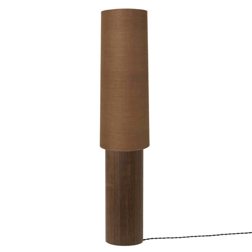 De Post Eclipse vloerlamp large solid van Ferm Living bestaat uit een houten armatuur en een lampenkap. Het houten armatuur heeft een diameter van 18 centimeter en een hoogte van 70 centimeter. Het armatuur is gemaakt van FSC™-gecertificeerd gerookt eikenfineer met MDF-kern en is voorzien van een zwart stoffensnoer met een lengte van 2,6 meter en een aan/uit-schakelaar. De lamp heeft een grote E27 fitting en is geschikt voor een lichtbron met een maximaal wattage van 15W. De lampenkap heeft een diameter van 30 centimeter en een hoogte van 80 centimeter. De lampenkap is bekleed met een stof bestaande uit 90% linnen en 10% polyester. De vloerlamp is in verschillende kleuren te verkrijgen.