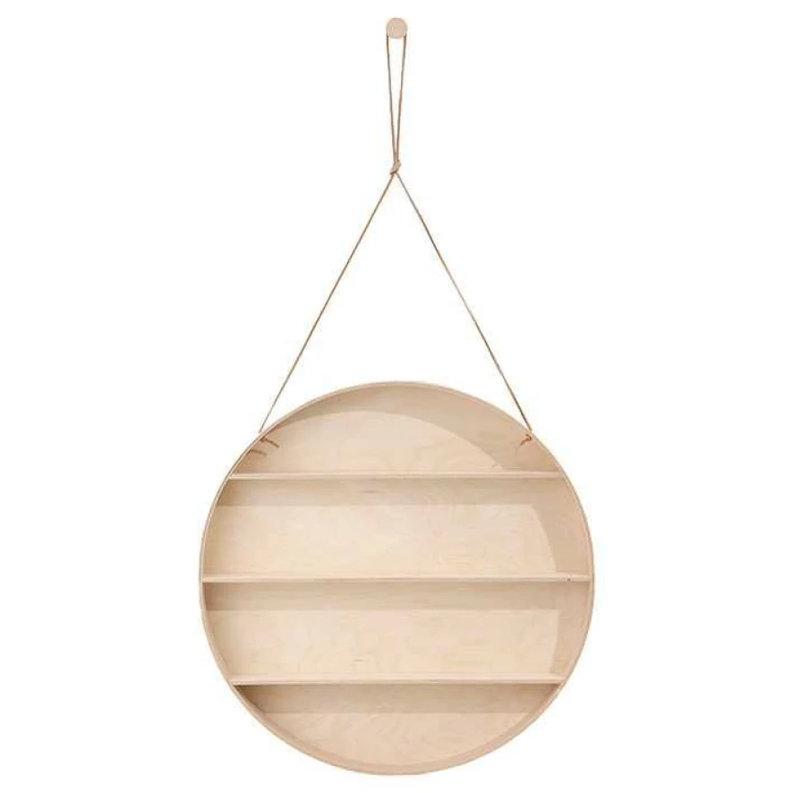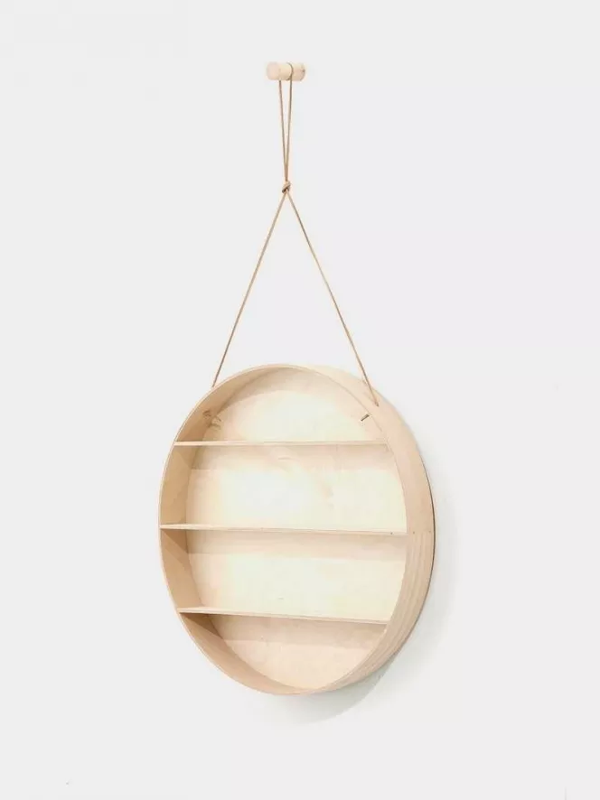 Het Round Dorm muurkastje van Ferm Living is 6,5 centimeter diep en heeft een diameter van 55 centimeter. Het muurkastje is gemaakt van berkenmultiplex en beukenhout en heeft een leren koord. De haak waaraan het (koord van het) kastje kan worden opgehangen, is ook gemaakt van beukenhout.