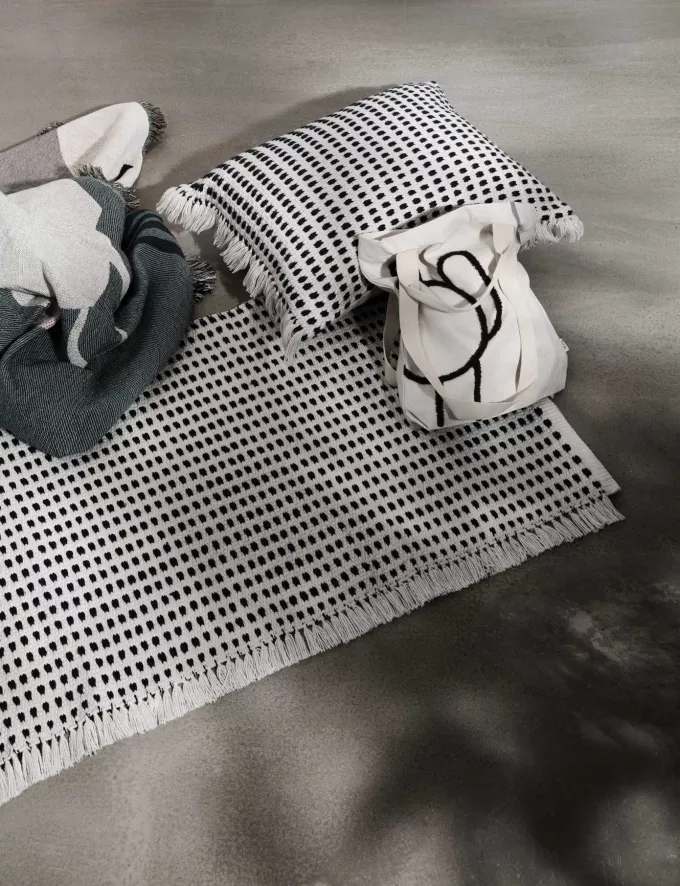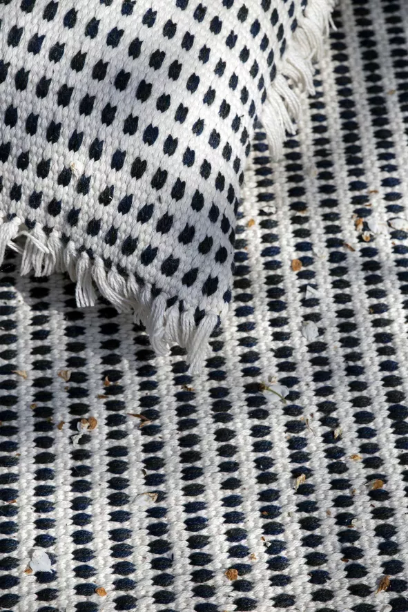 Het Ferm Living Way vloerkleed 70×180 kun je zowel binnen als buiten gebruiken en is bijvoorbeeld erg geschikt voor in de badkamer. Het kleed bestaat volledig uit polyester, verkregen uit 148 gerecyclede plastic flesjes. Het vloerkleed kan eventueel gewassen worden op 30 graden. De Way vloerkleden worden gemaakt in een fabriek in India in de stad Bhadohi. Dit stadje staat bekend als de tapijtenstad. De regio heeft een rijke weef geschiedenis. In de fabriek werken ongeveer 1200 mensen en er staan 900 Punja weefgetouwen, 100 handweefgetouwen, 100 elektrische weefgetouwen en 5 van de Wiele machines. Ongeveer 65% van de werknemers is vrouw en er is een kinderopvang op het terrein.