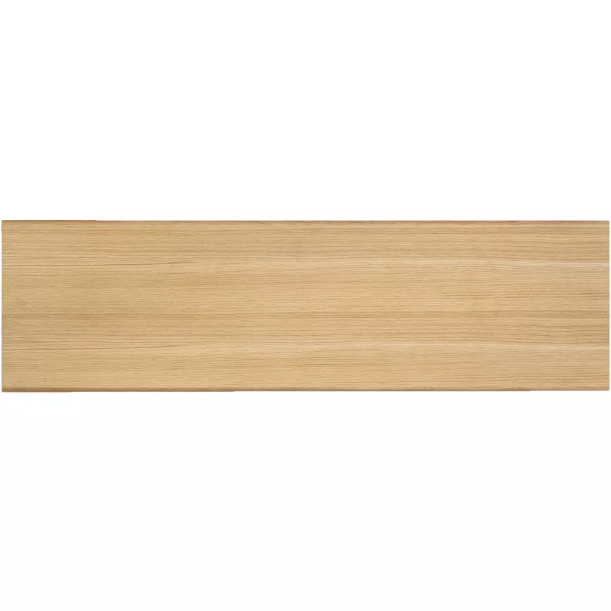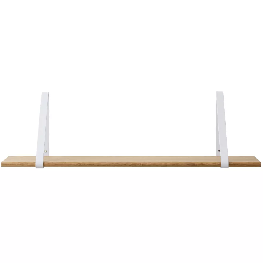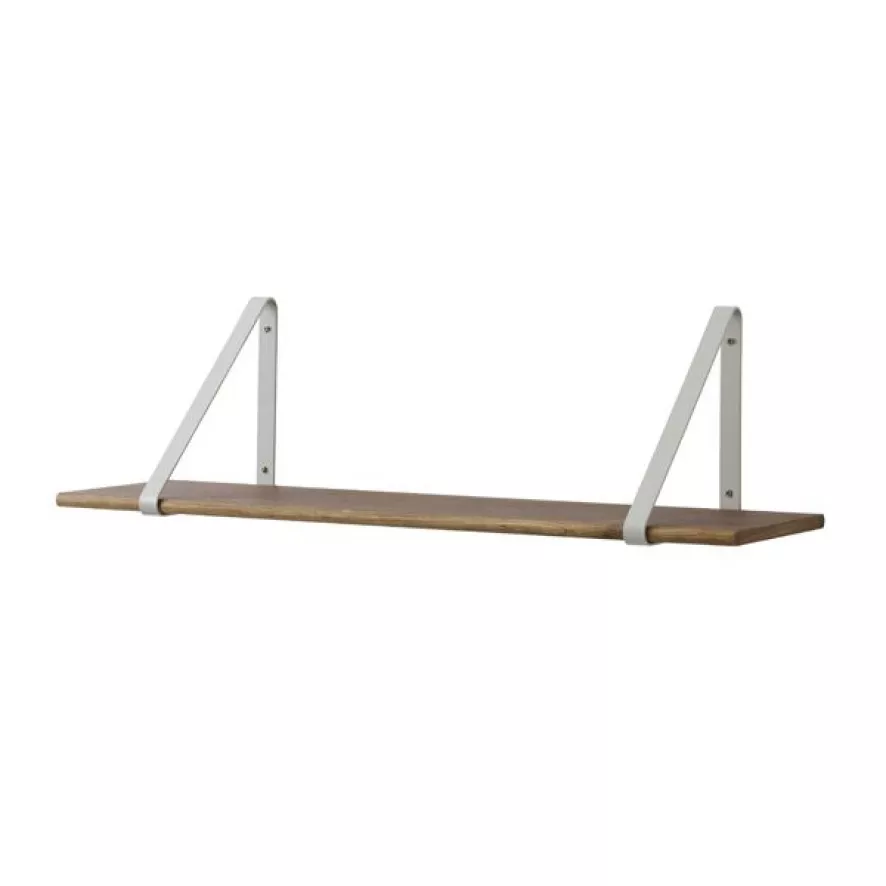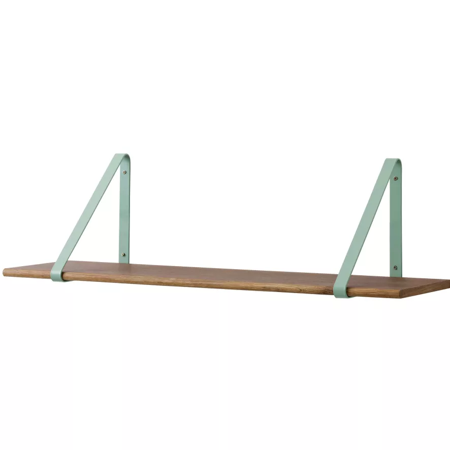 De Wooden Shelf wandplank van Ferm Living heeft een breedte van 85 centimeter, een diepte van 24 centimeter en een hoogte van 24 centimeter. De wandbeugels zijn gemaakt van gepoedercoat metaal en de planken zijn van eikenfineer met drie verschillende afwerkingen: gerookt eiken, geolied eiken en zwart gebeitst eiken. De beugels zijn leverbaar in vijf kleuren: zwart, grijs, wit, mint en roze. Let op: de beugels en de wandplank moeten apart worden gekocht